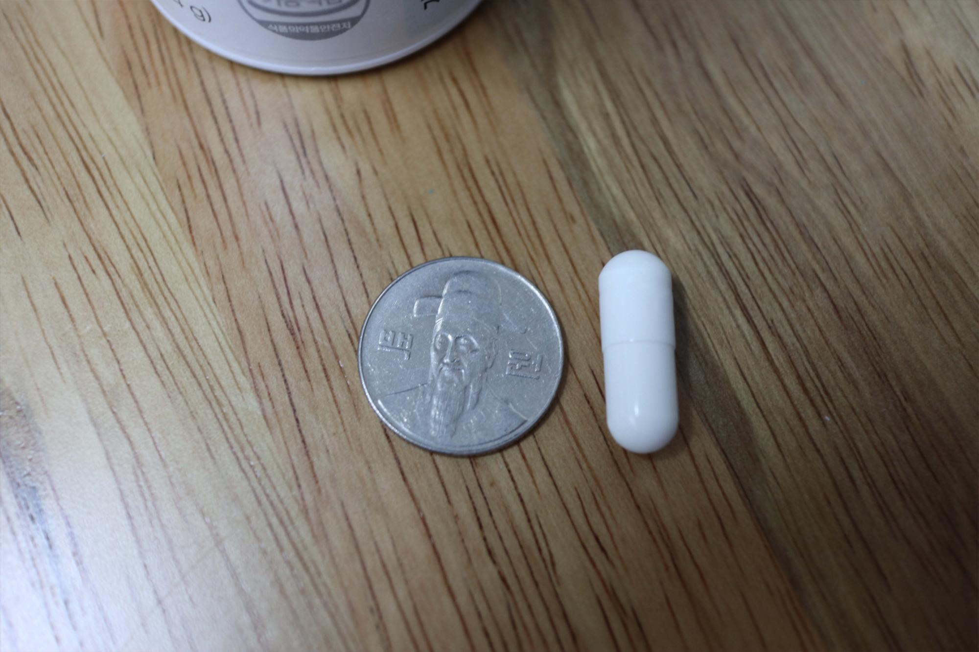 드시모네 캡슐은 백원짜리 동전의 지름과 거의 동일합니다. 상당히 큰 캡슐 알약에 속하는 것 같은데요 역시나 목넘김이 그렇게 편하지는 않습니다. 특히나 제가 큰 알약을 잘 못삼키는 스타일이라는 것 알려드립니다.